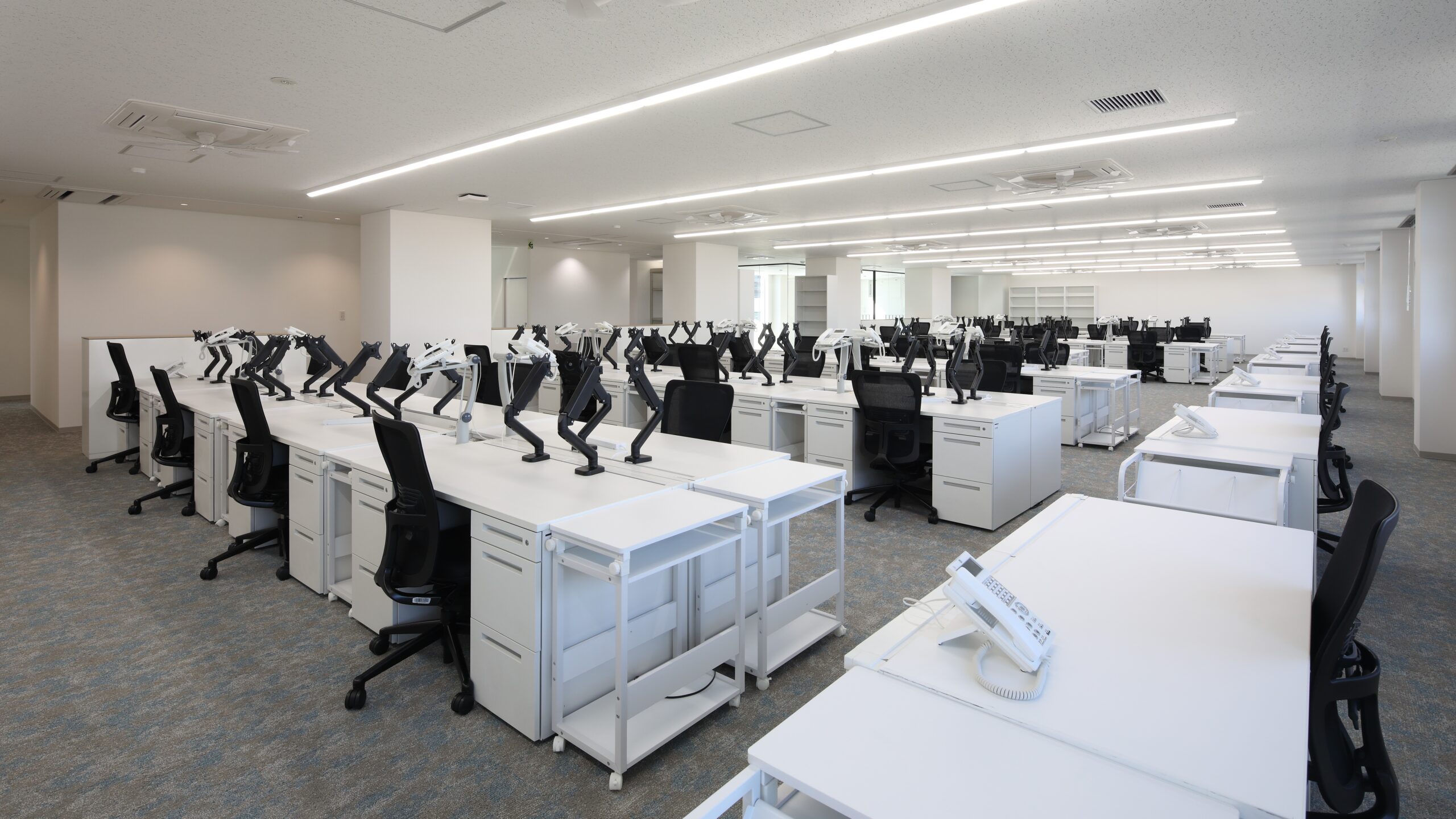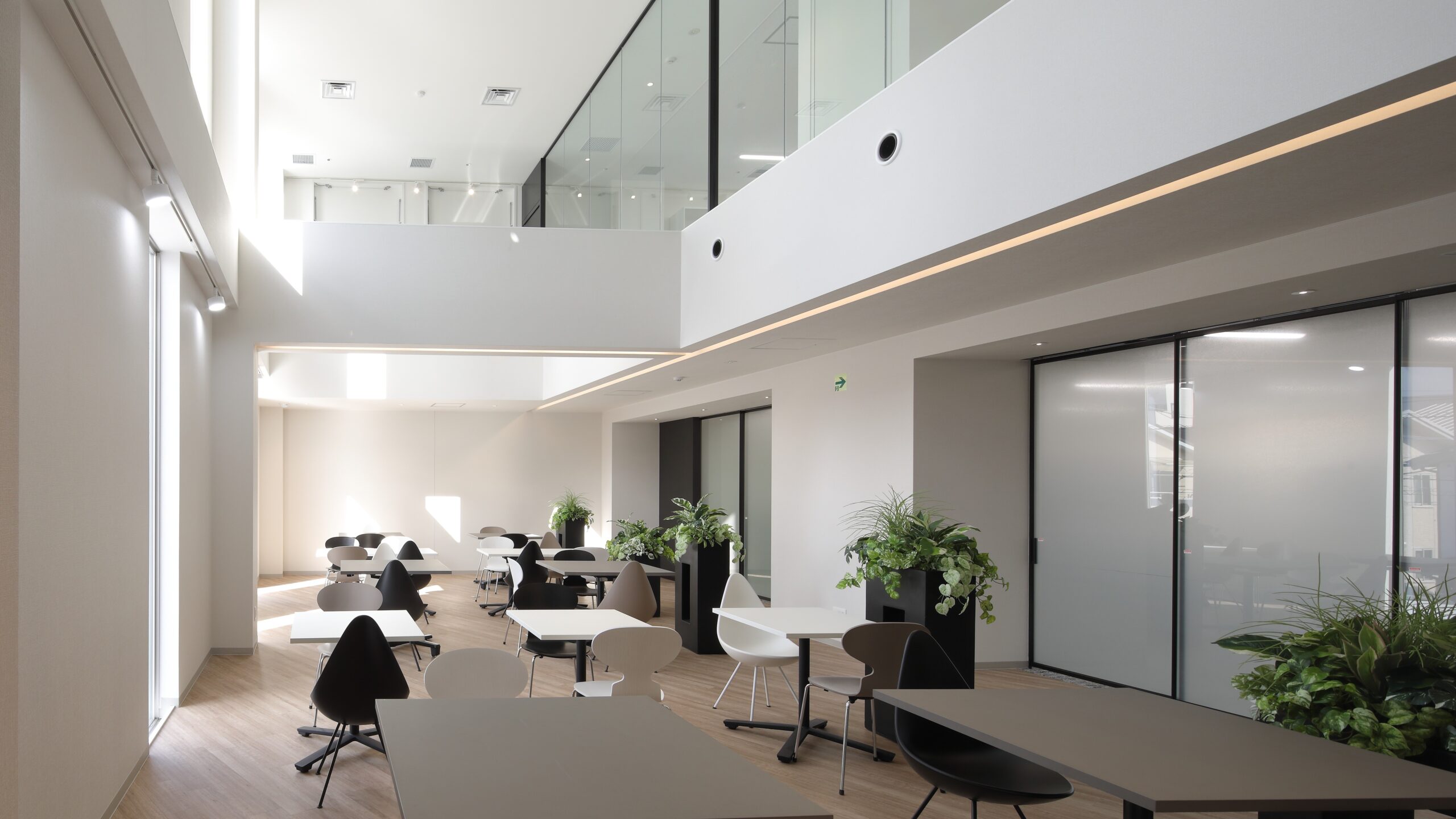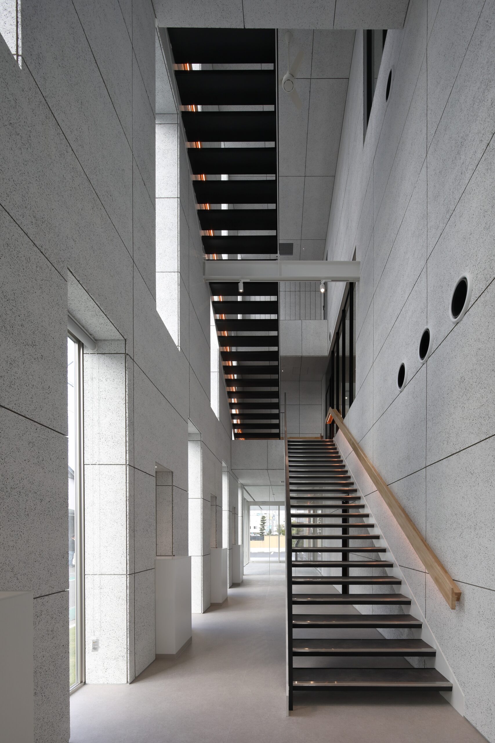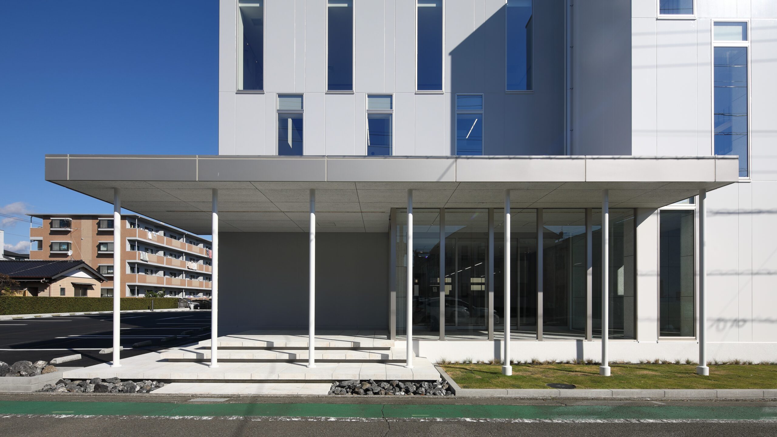 土木インフラを中心とした建設コンサルタント会社の新社屋計画。構造柱と隠し竪樋を組み合わせたエントランスをメインに、リズミカルな外観とした。階段ホールとリフレッシュスペースは開放感のある吹き抜けとしている。エントランスからも見える階段ホールは、小さな企業ミュージアムのように設え、愛着の醸成や会社紹介時に活躍する場を目指した。災害時にも地域に求められる職責を全うしたいという要望を受け、ソーラーパネルや電気自動車(V2H)を備えた停電時にも一部の業務を稼働できる社屋となっている。(担当:田島・石田)