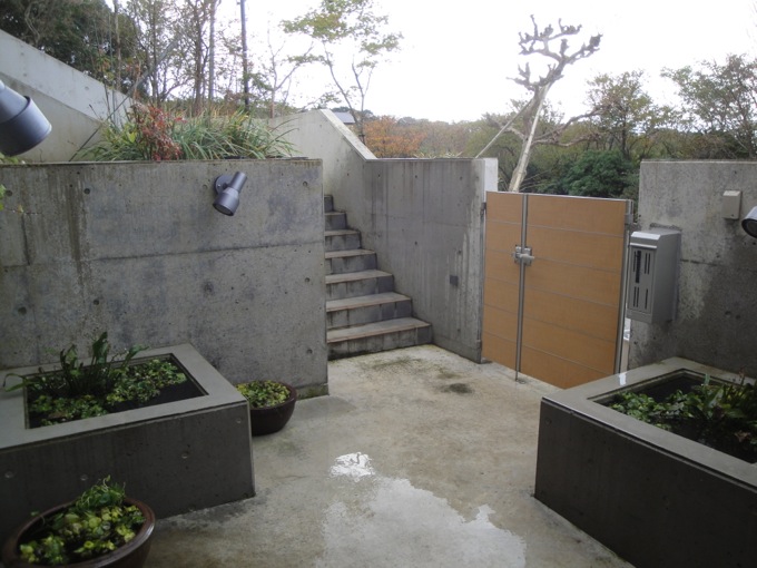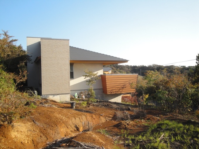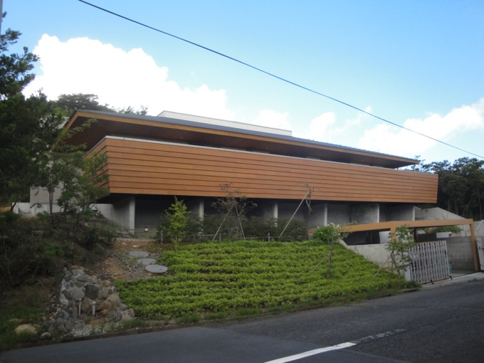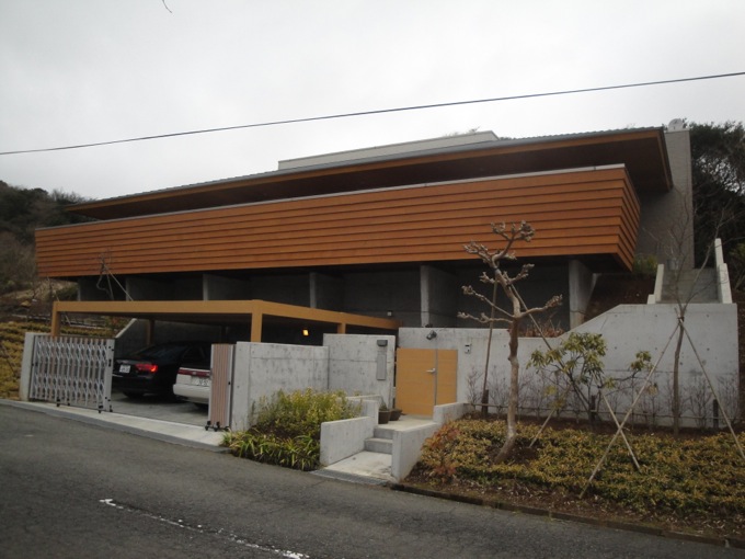 駿河湾を見下ろす別荘地に建つ平屋建て木造住宅。傾斜地の為、床は道路より3.5m高く眺望とプライバシーを確保している。
