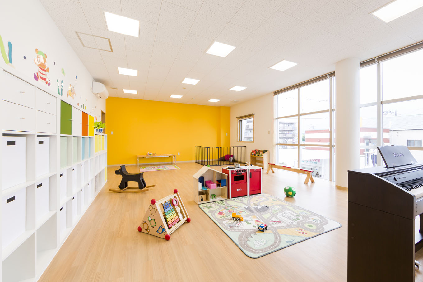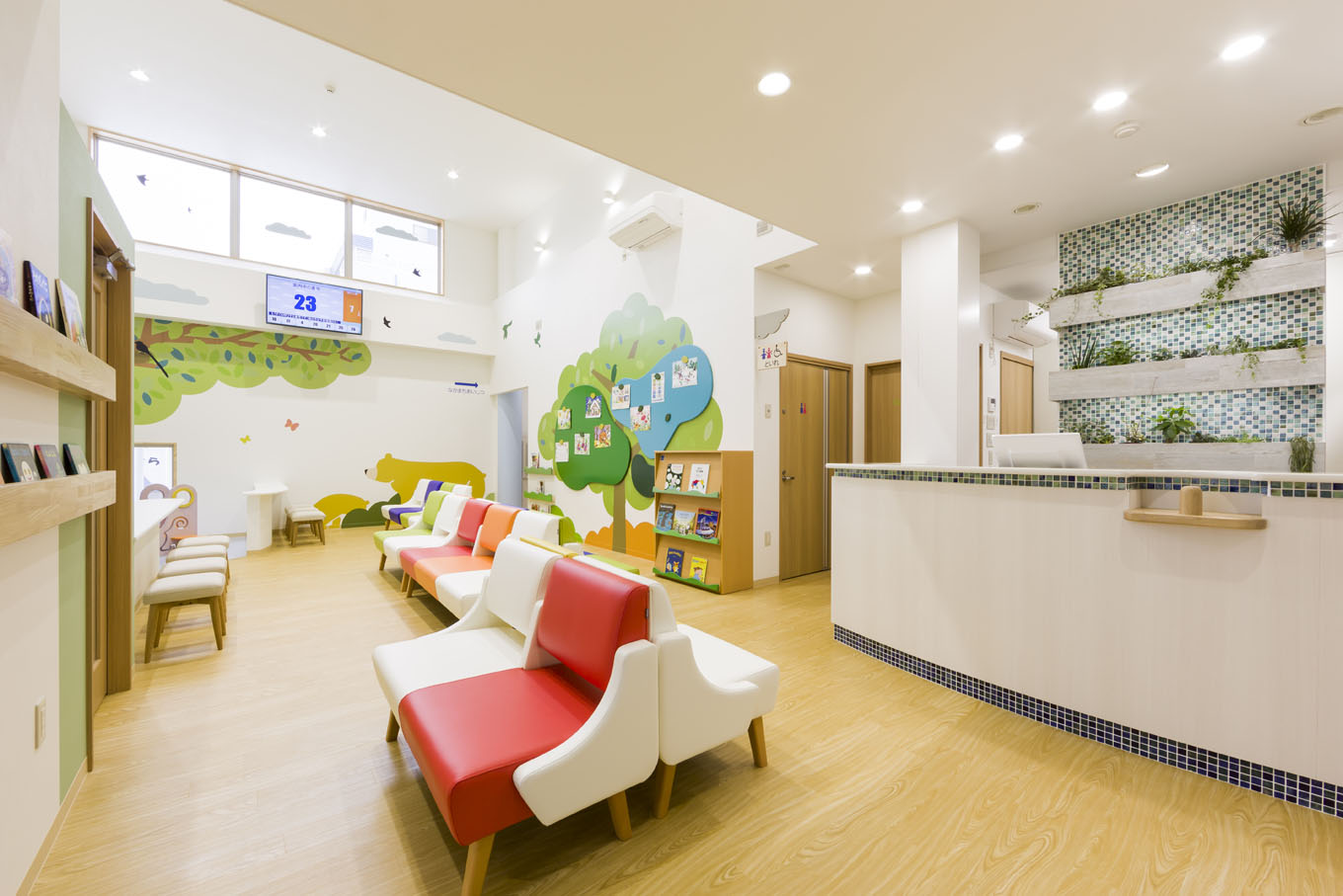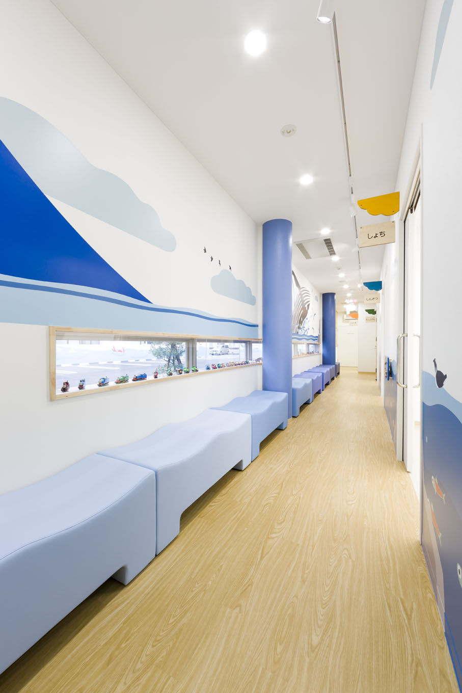 小児科クリニックと保育所が併設された建物の新築計画である。 内外共に子供が楽しめるデザインとしている。外観は船に見立て、カラフルなボックスがリズミカルに外壁に取り付けている。内部は森や駿河湾をイメージしたイラストを壁面に設置し、子供が楽しめつつ地域性も反映したデザインとしている。 (担当:鈴木)